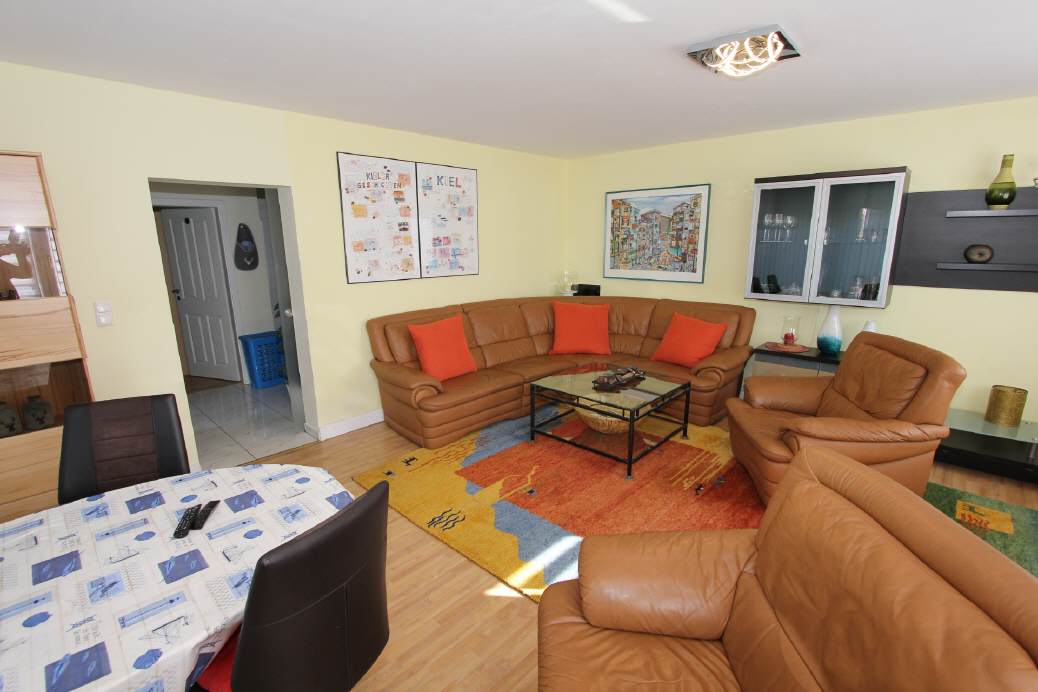 The apartment is located on the ground floor of a three-family house, directly at the local recreation area Kiel-Russee. The apartment has a size of approximately 100 square meters and is exclusively furnished.