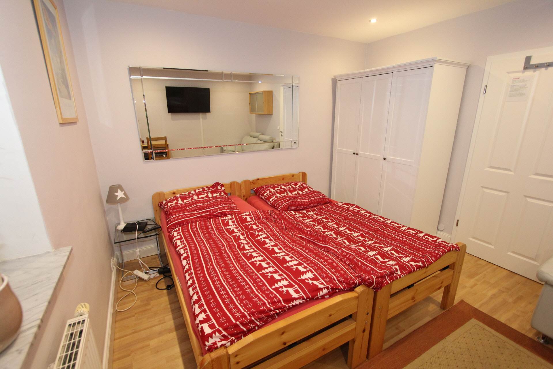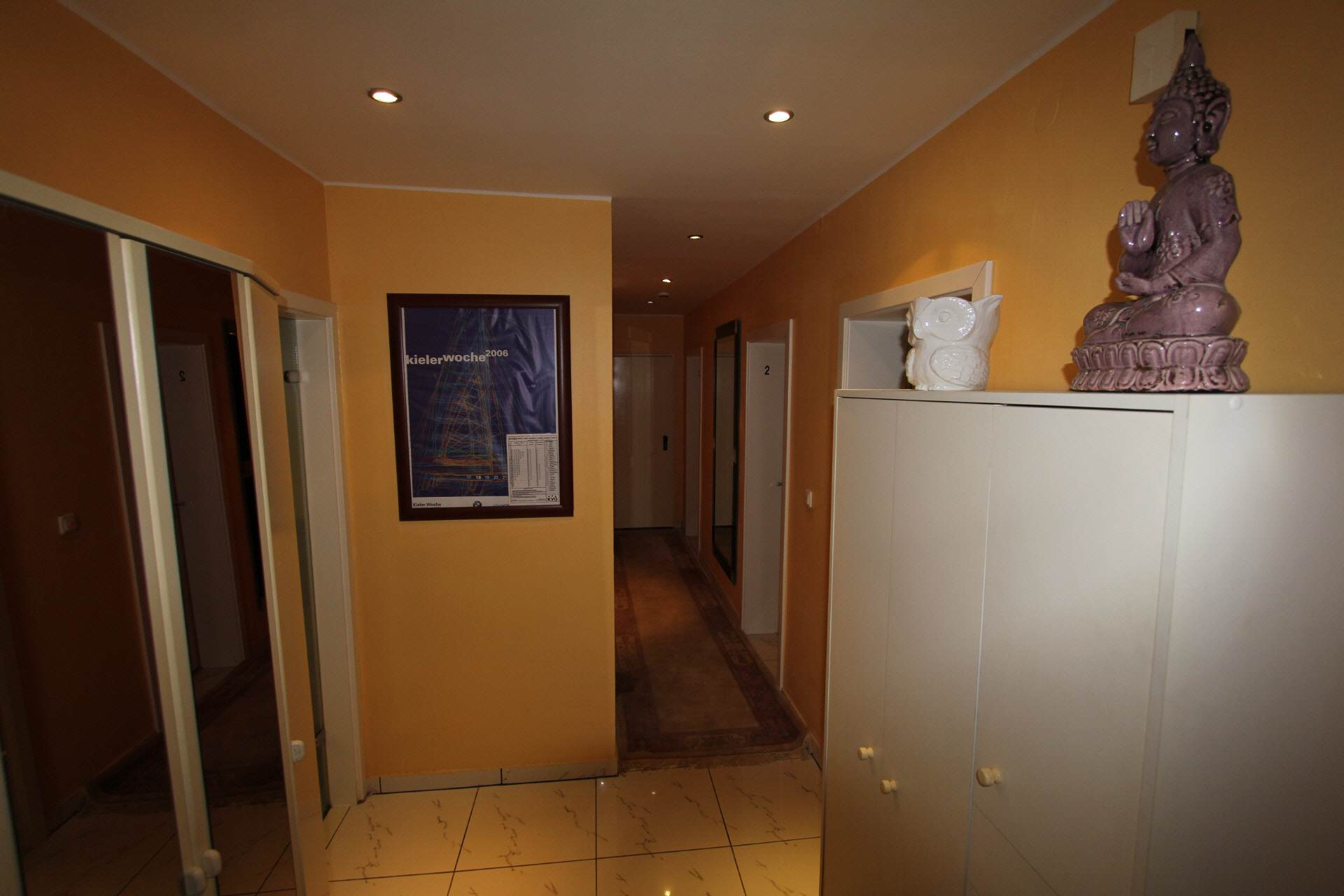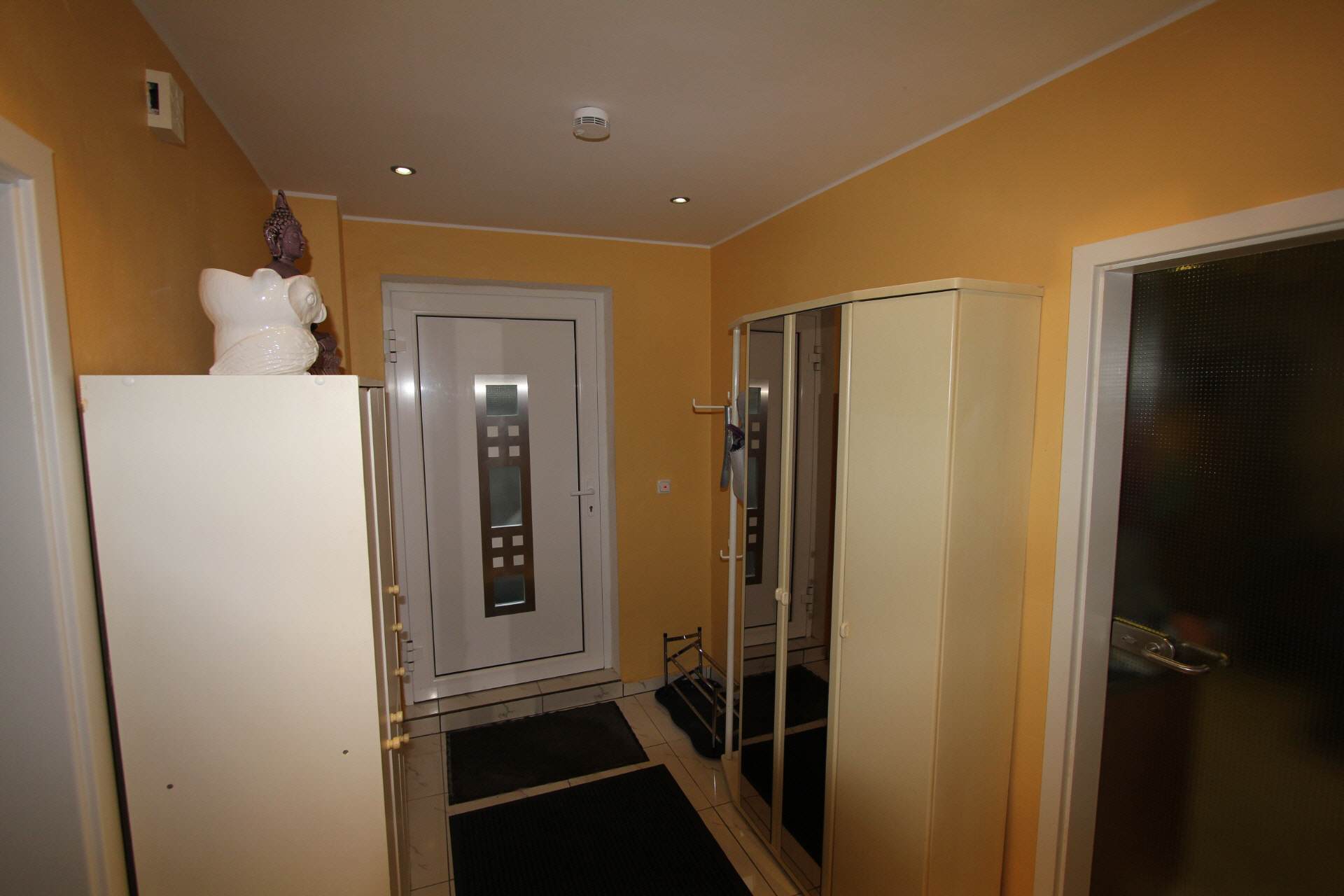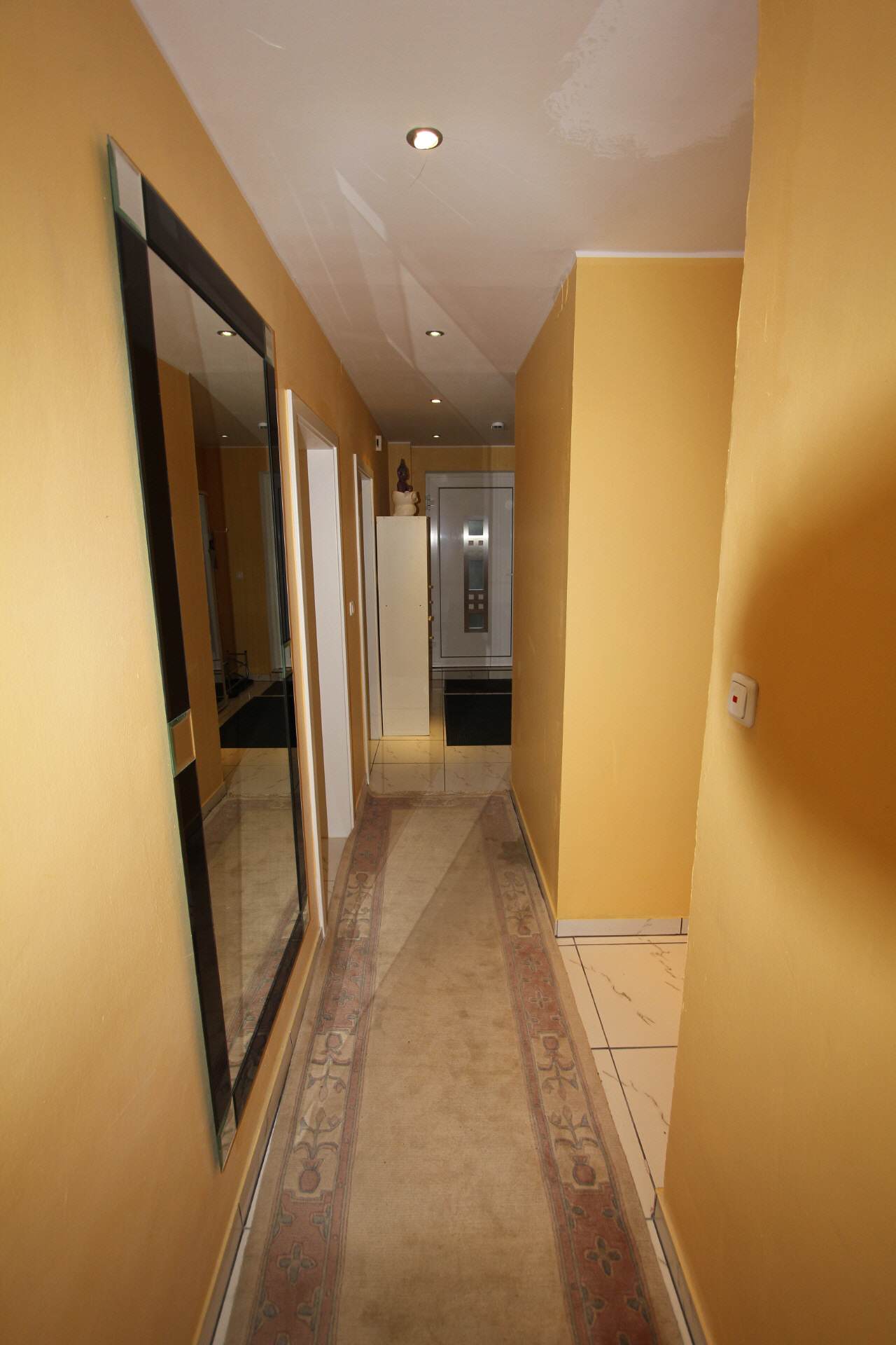 The hallway is equipped with a wardrobe and a large full-length mirror.