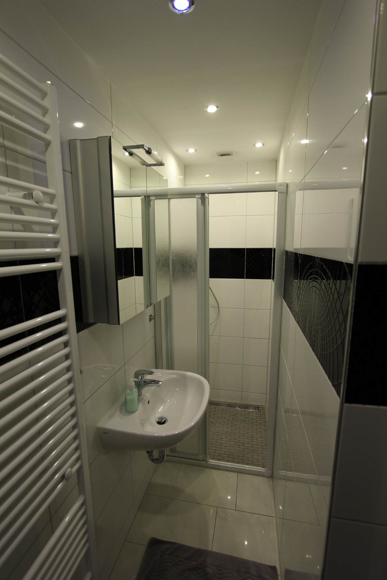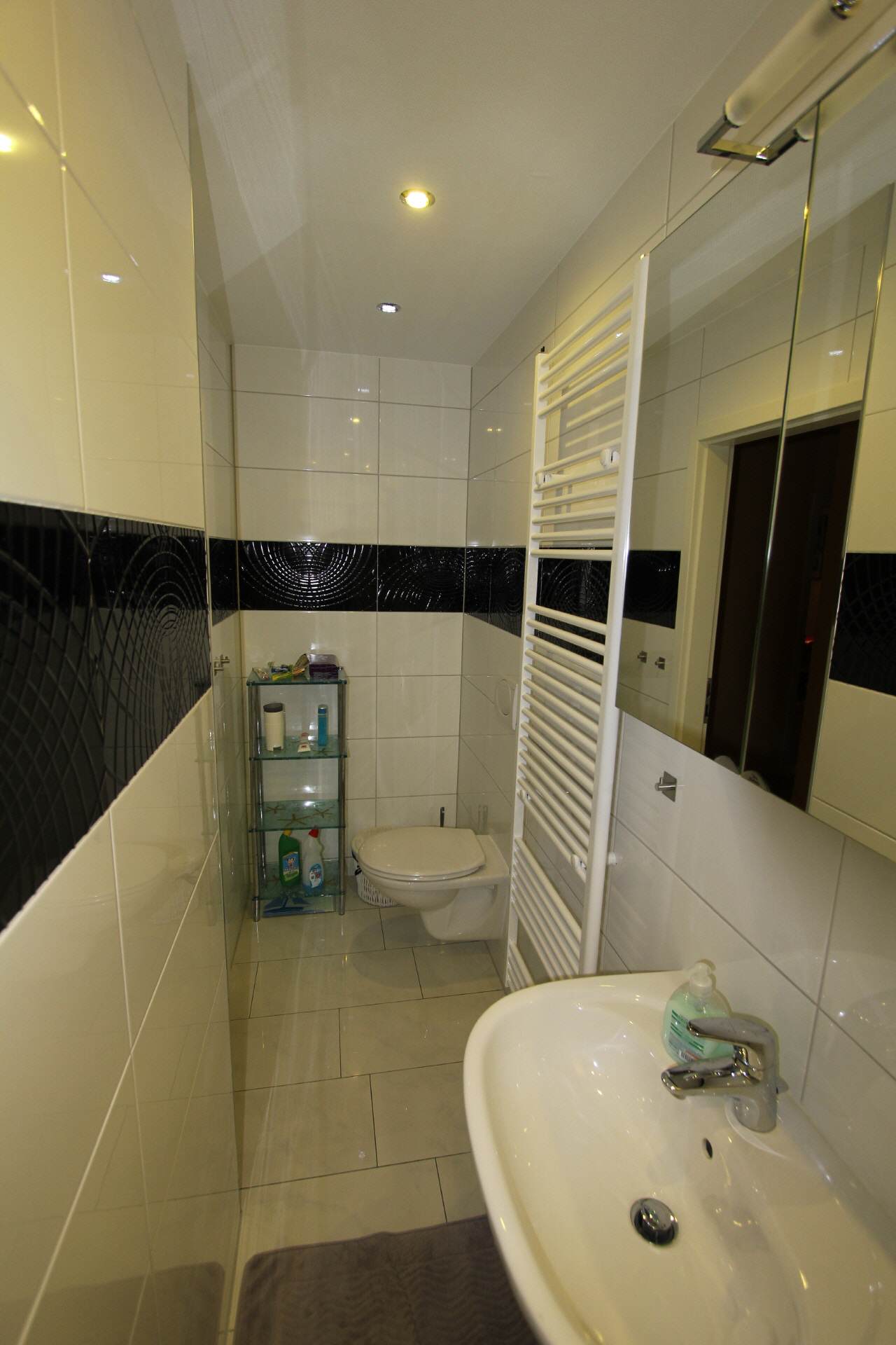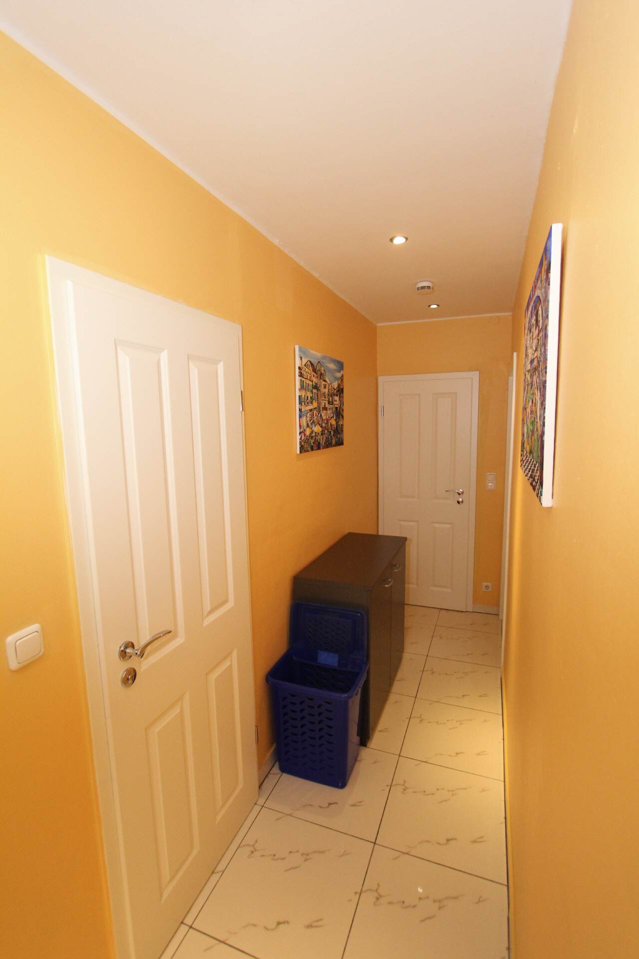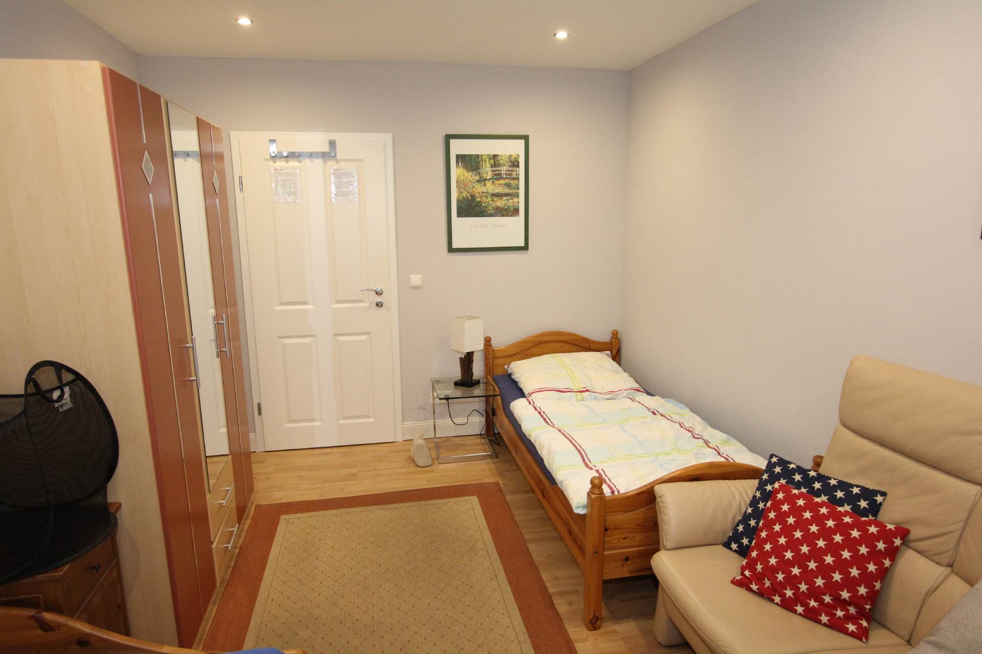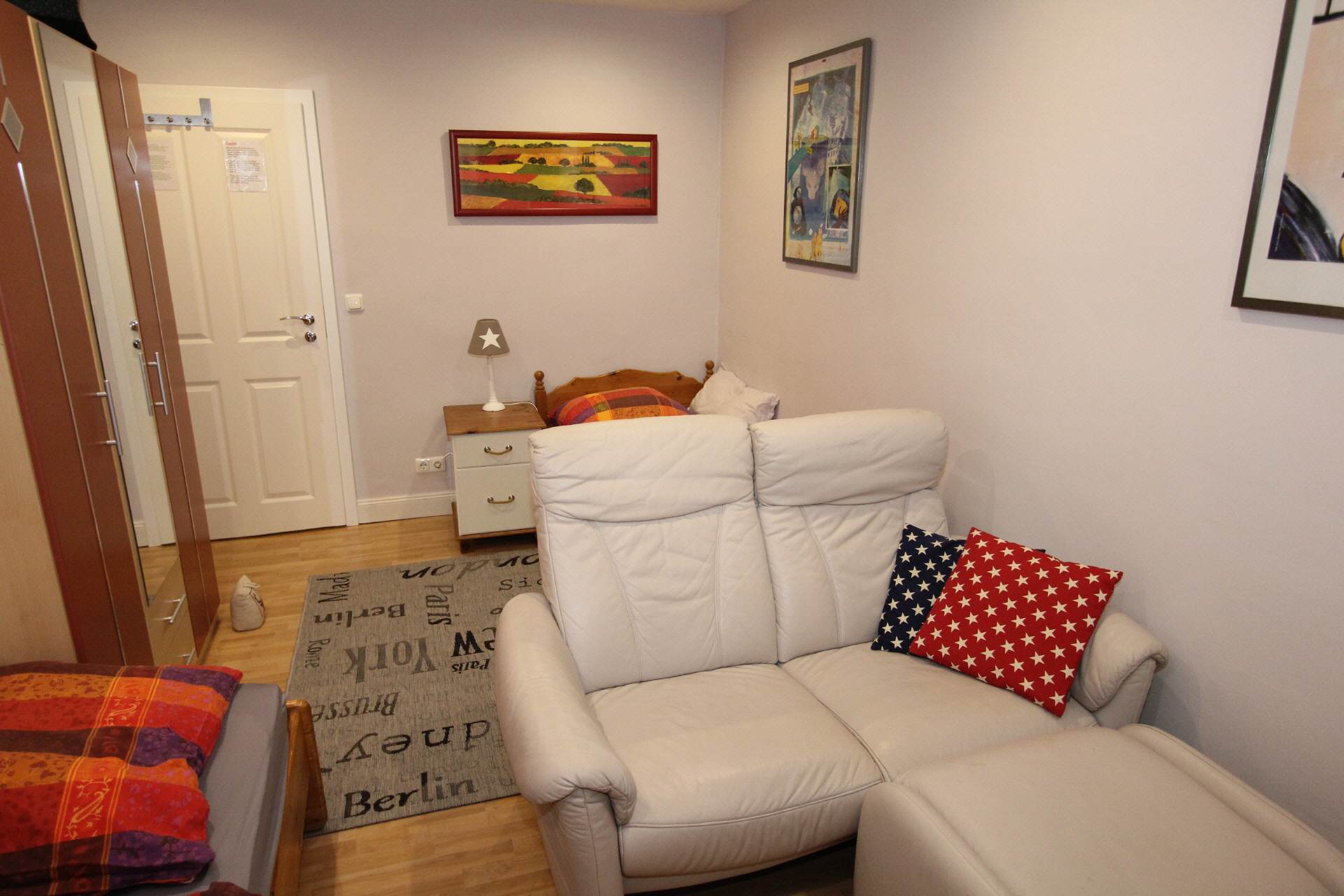 The hallway is equipped with a wardrobe and a large full-length mirror.