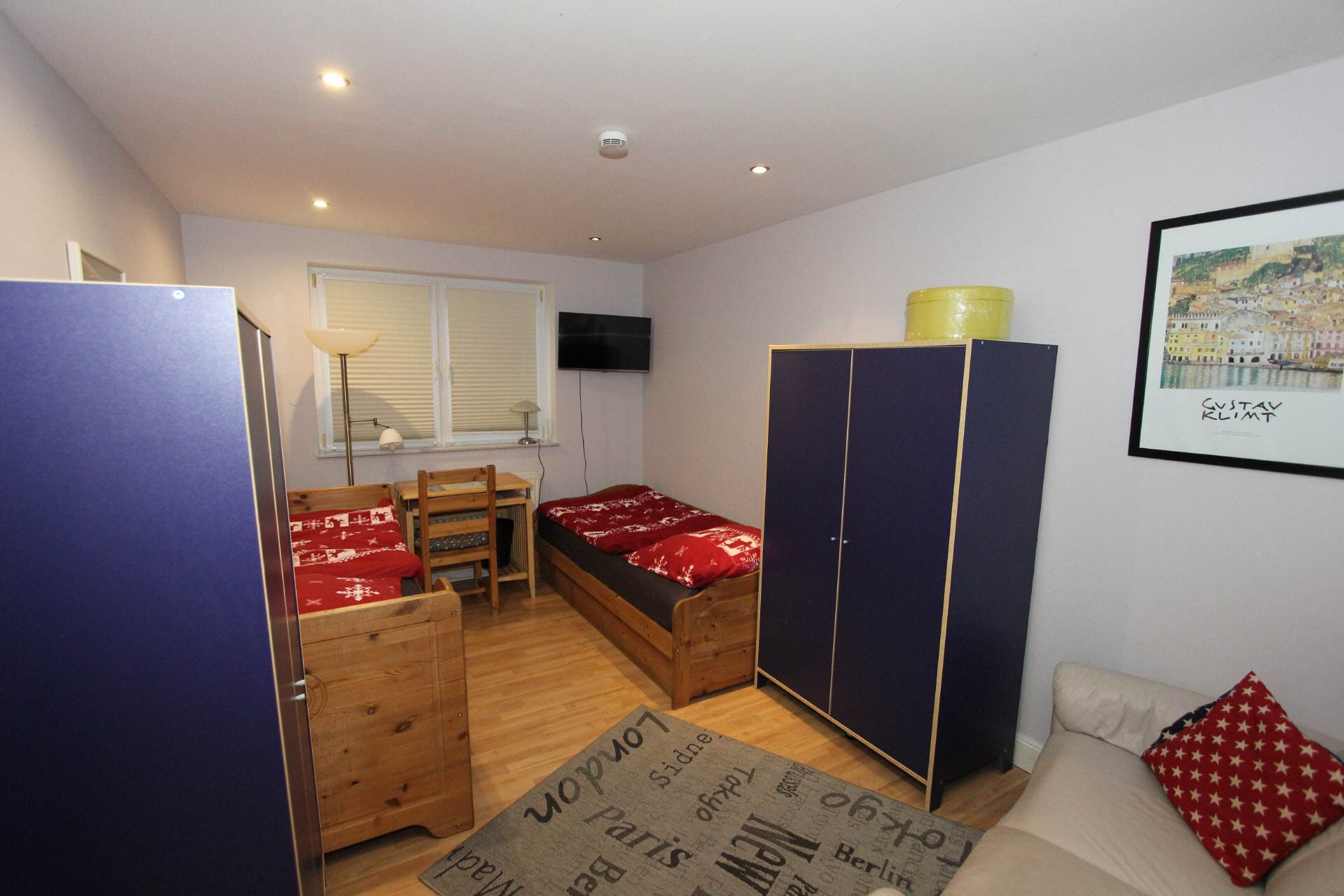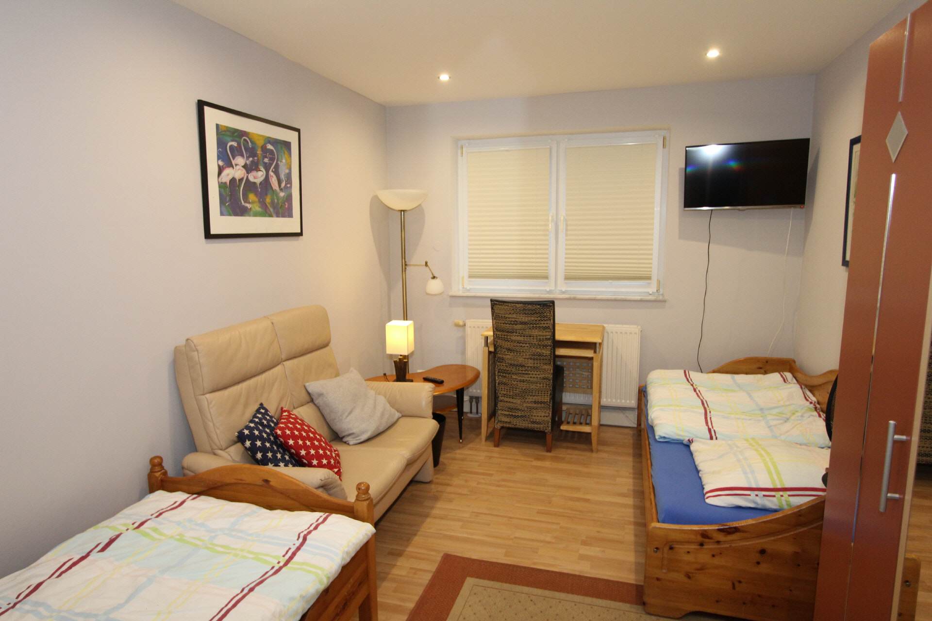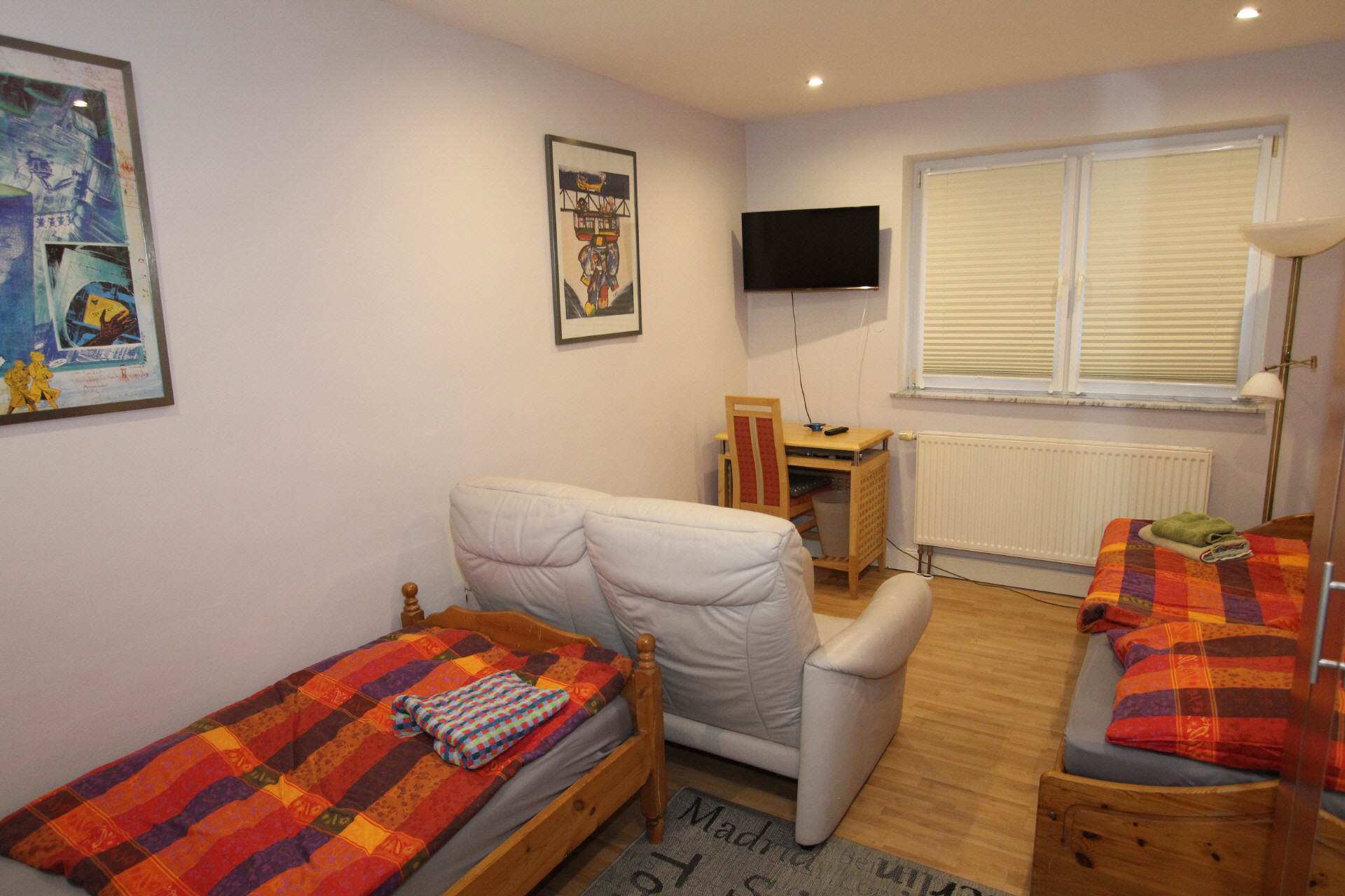 In the four cozy bedrooms there are two single beds with bedside tables and a wardrobe with enough space for your luggage. Furthermore, a sofa and a desk with a chair as well as an LCD TV are included.