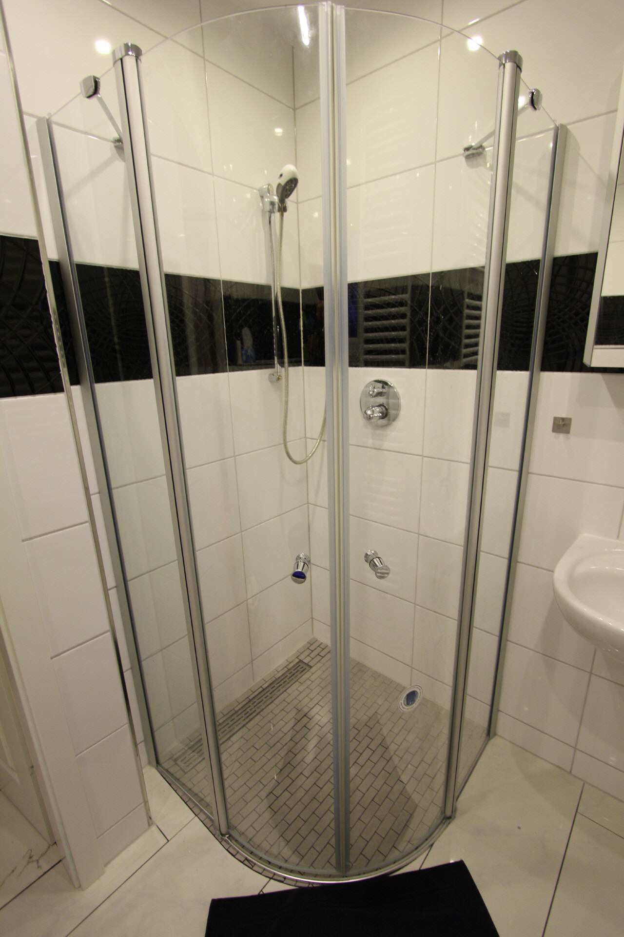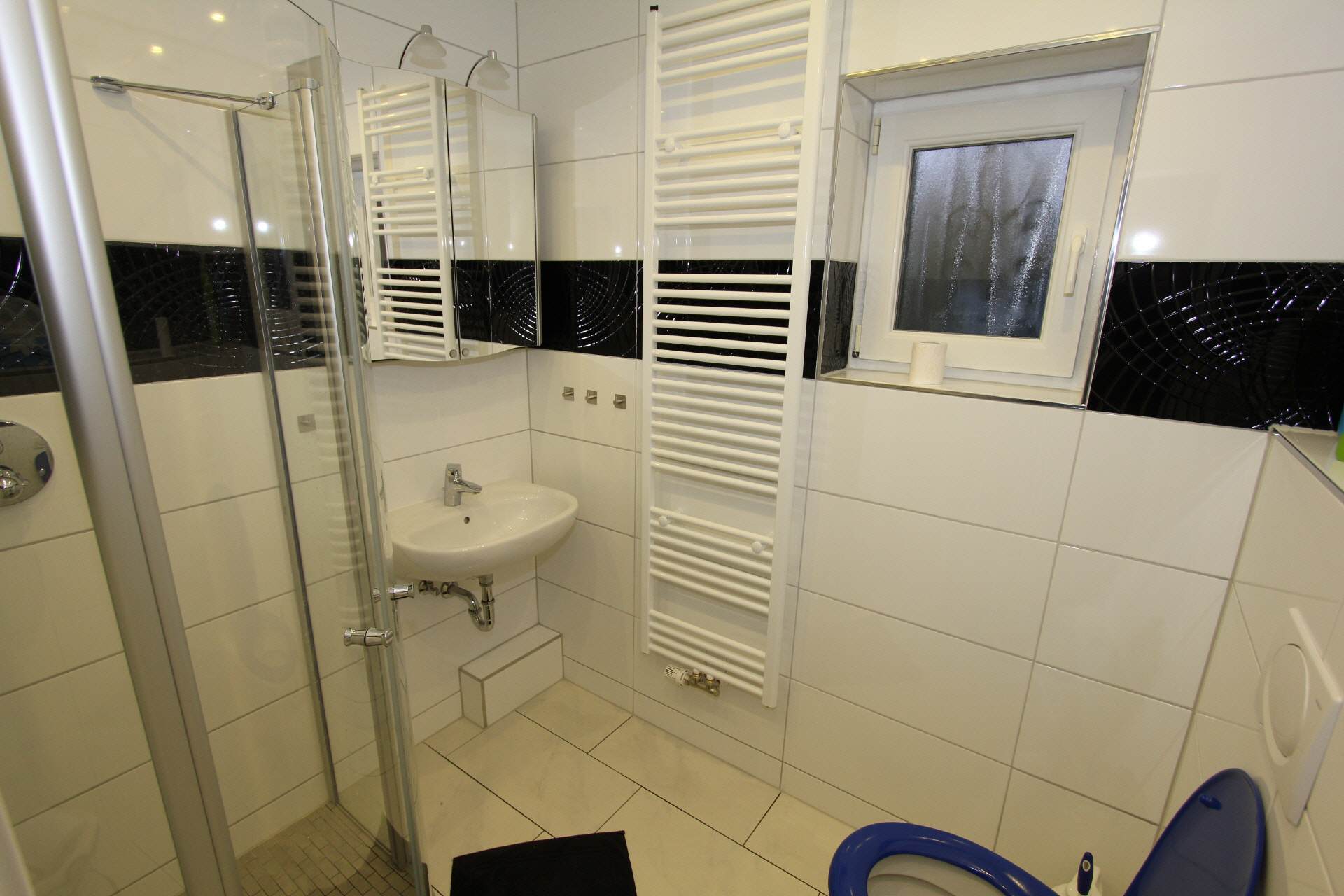 Two shower rooms have a shower, a toilet and a large sink. There is also a small set of towels.