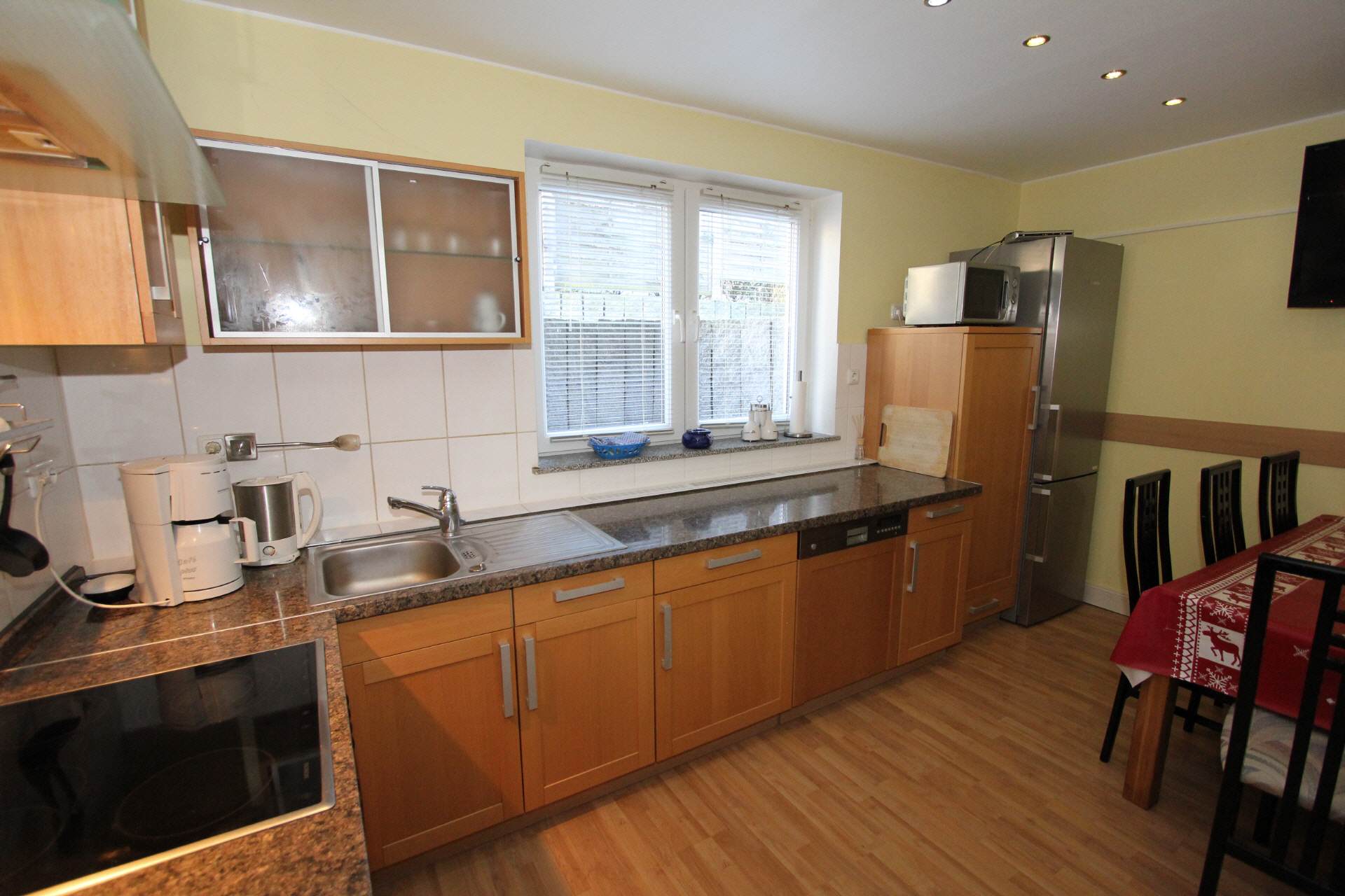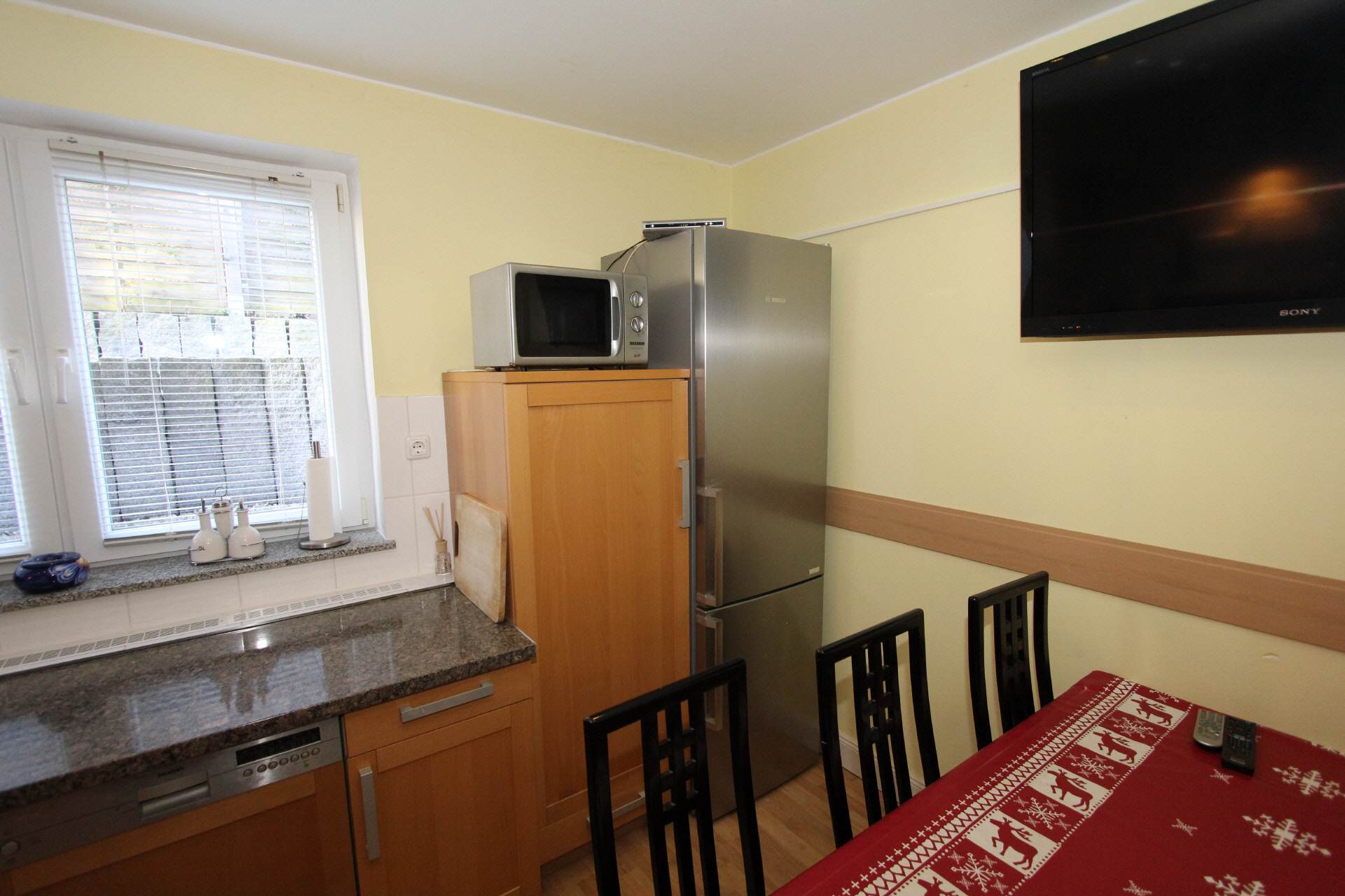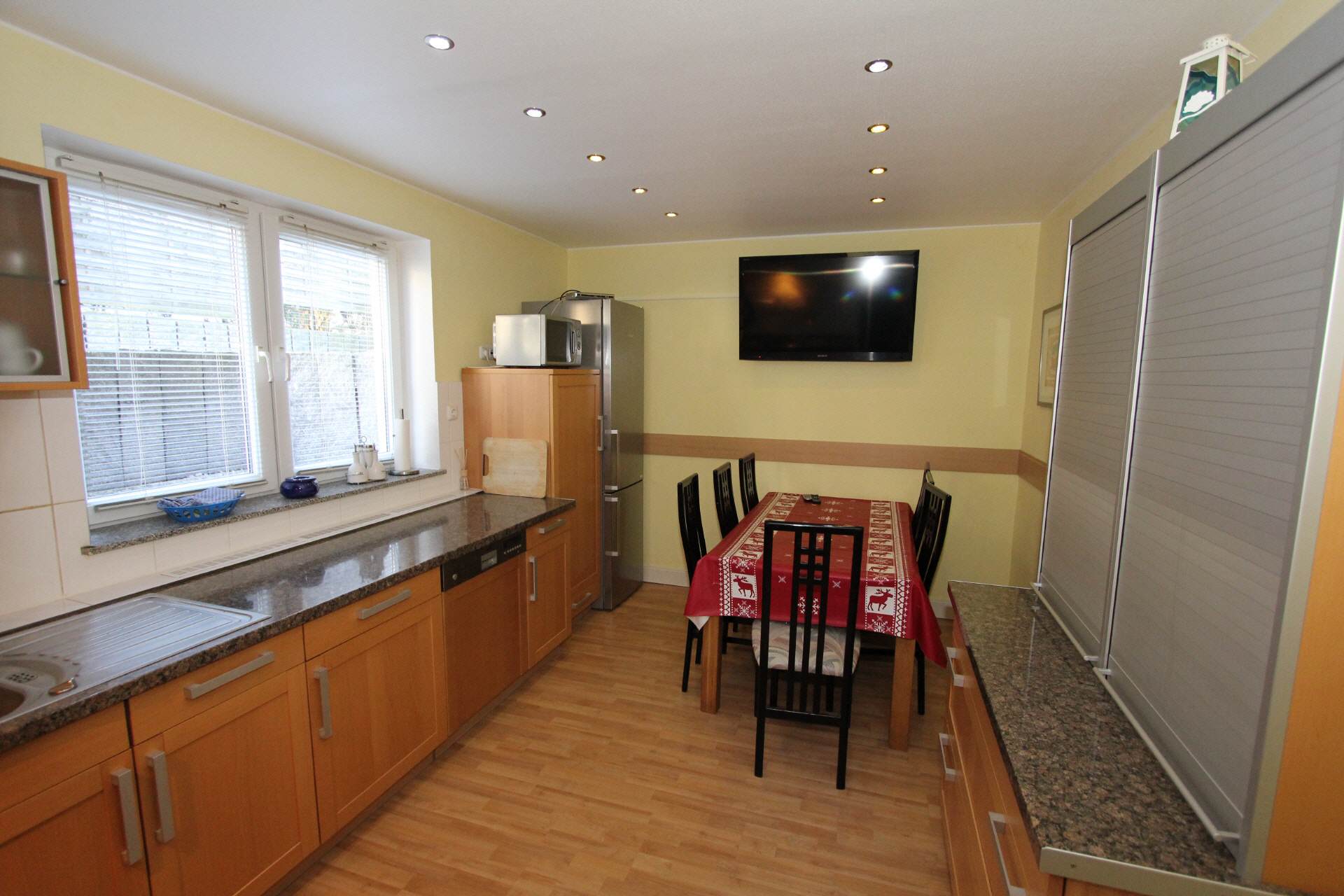 Large kitchen with an exclusive solid wood kitchen. Electric stove with ceramic hob, fridge-freezer, microwave ..... A television with satellite reception (Hotbird and Astra) completes the equipment.